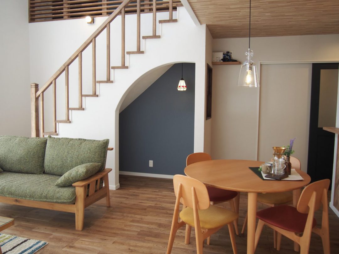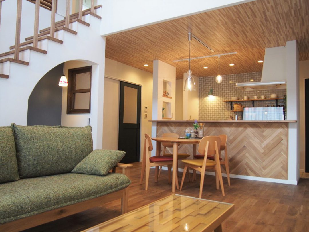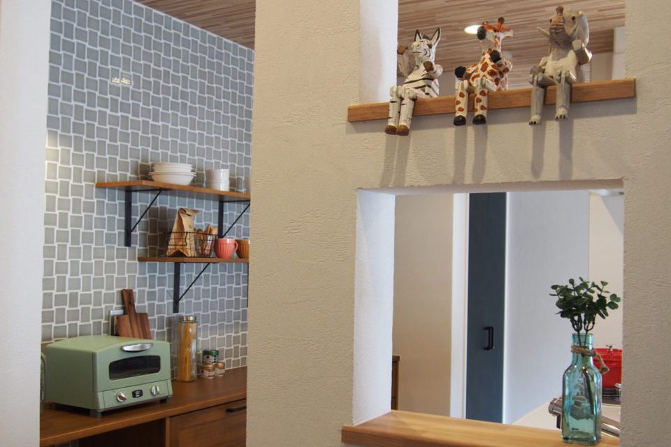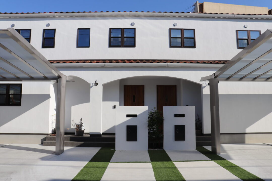 外国のプチホテルを思わせる真っ白な外壁とブラウンの洋瓦の二世帯住宅。南側は雑貨のディスプレイが楽しめそうな、ナチュラルかわいい空間に仕上がりました。