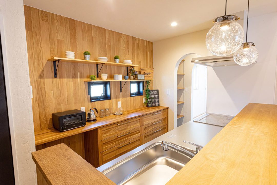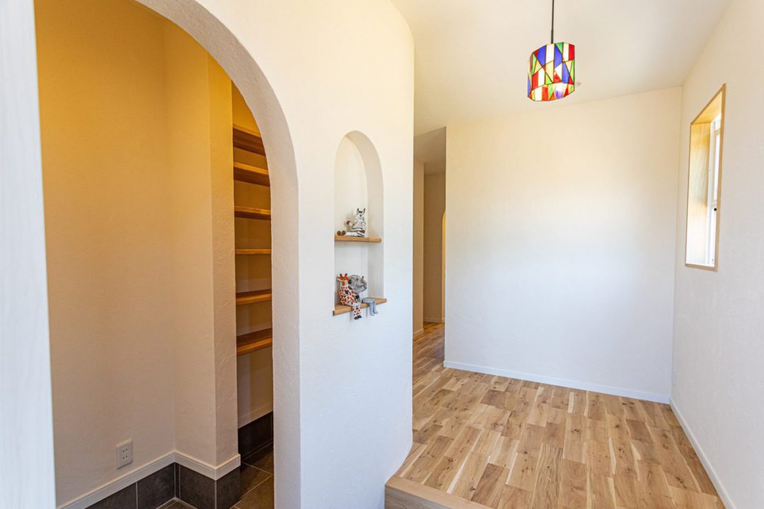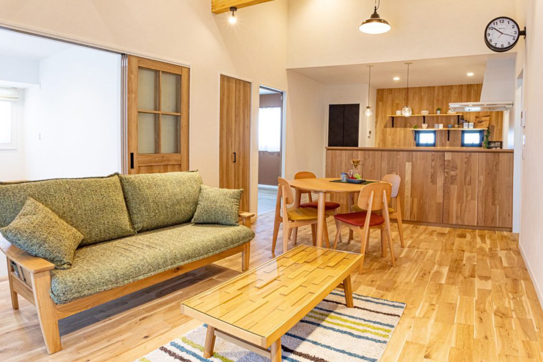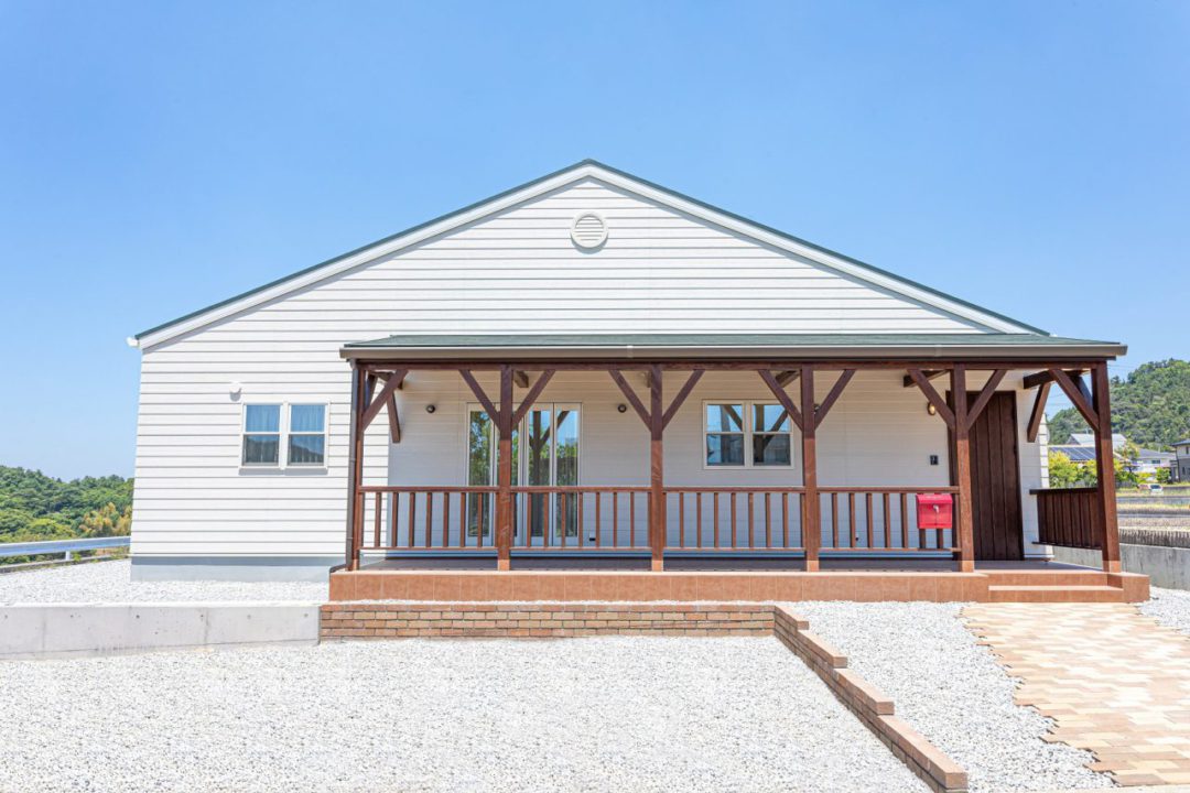 木の温もりを感じるシンプルでナチュラルな平屋。玄関前の広々としたカバードポーチでのんびりお茶したり、BBQをしたり、毎日の暮らしが楽しくなるお家です。