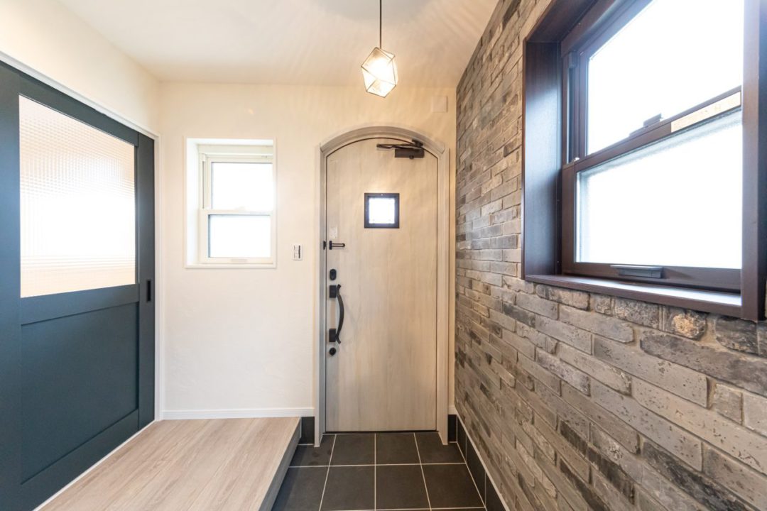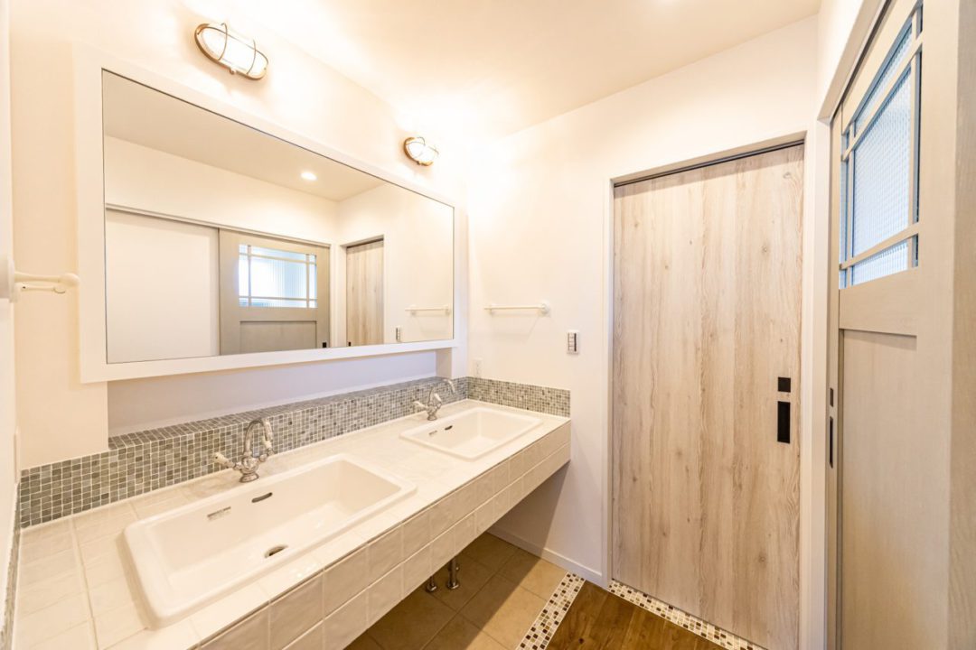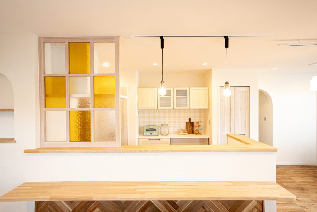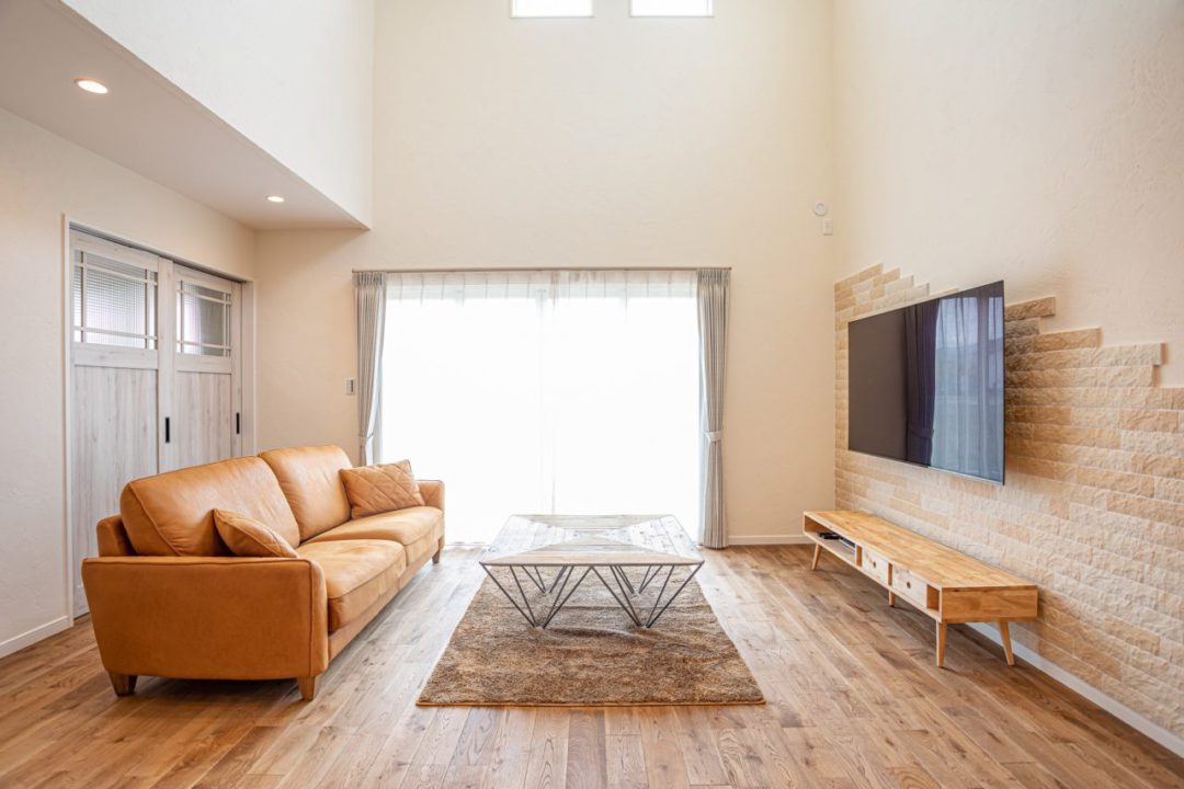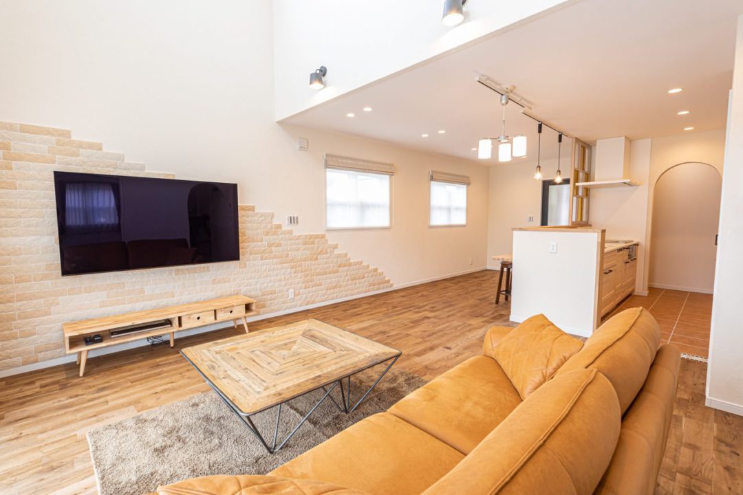 南からの温かな光に包まれる心地いいリビング。無垢のフローリングやタイルなどの自然素材に囲まれたナチュラルでかわいいお家です。