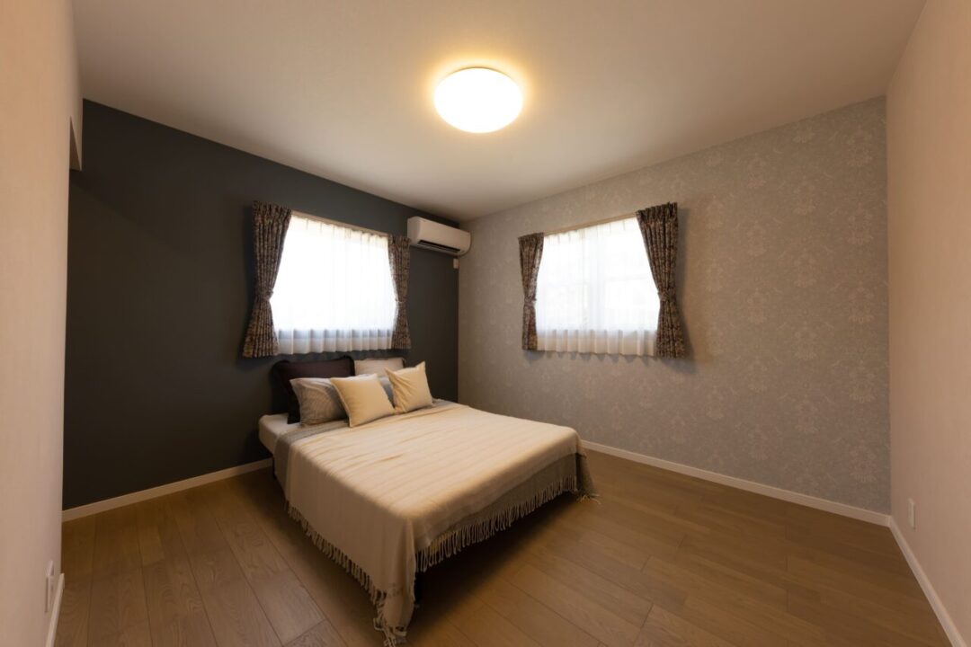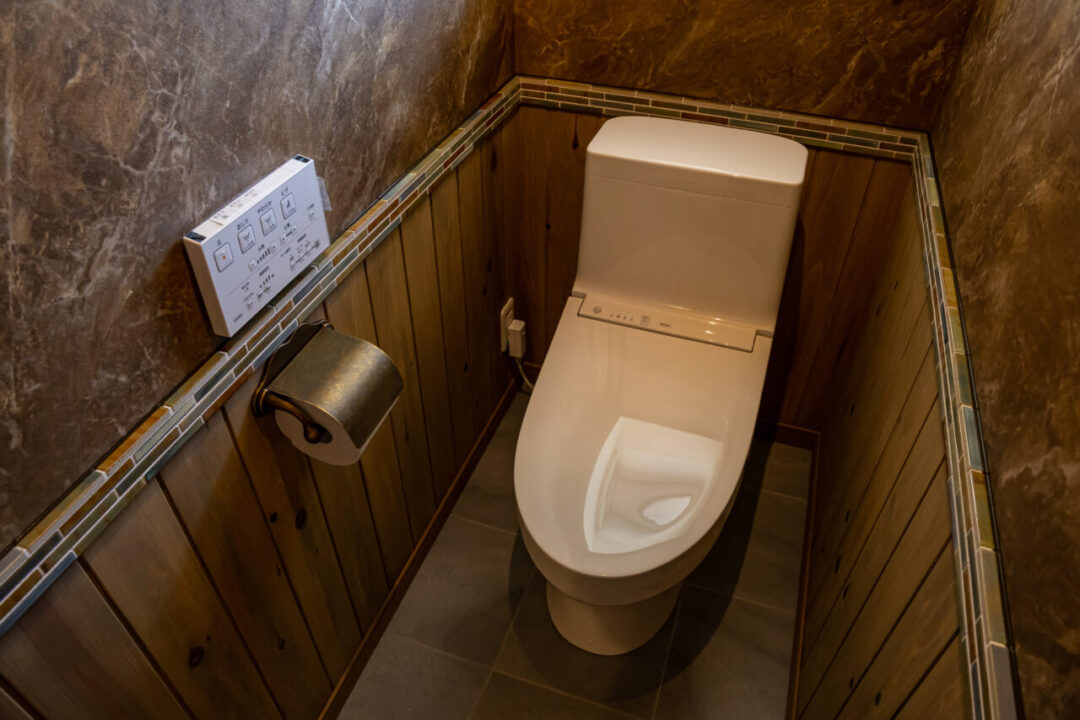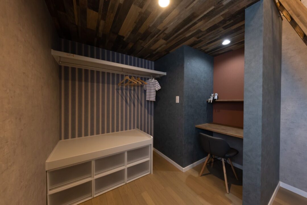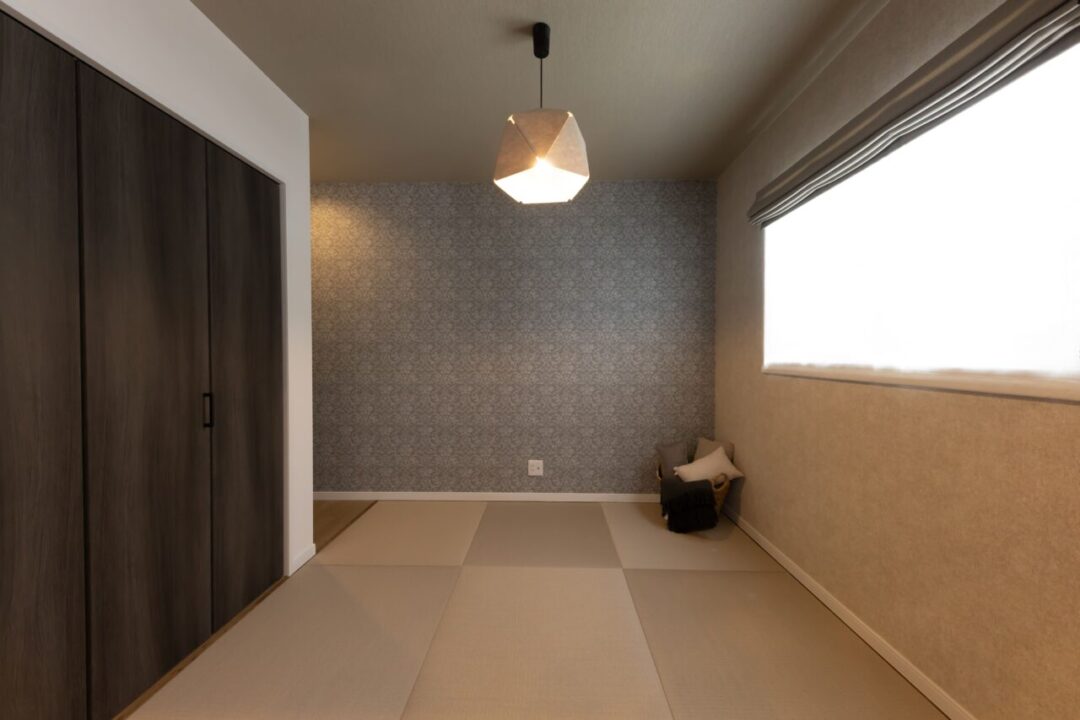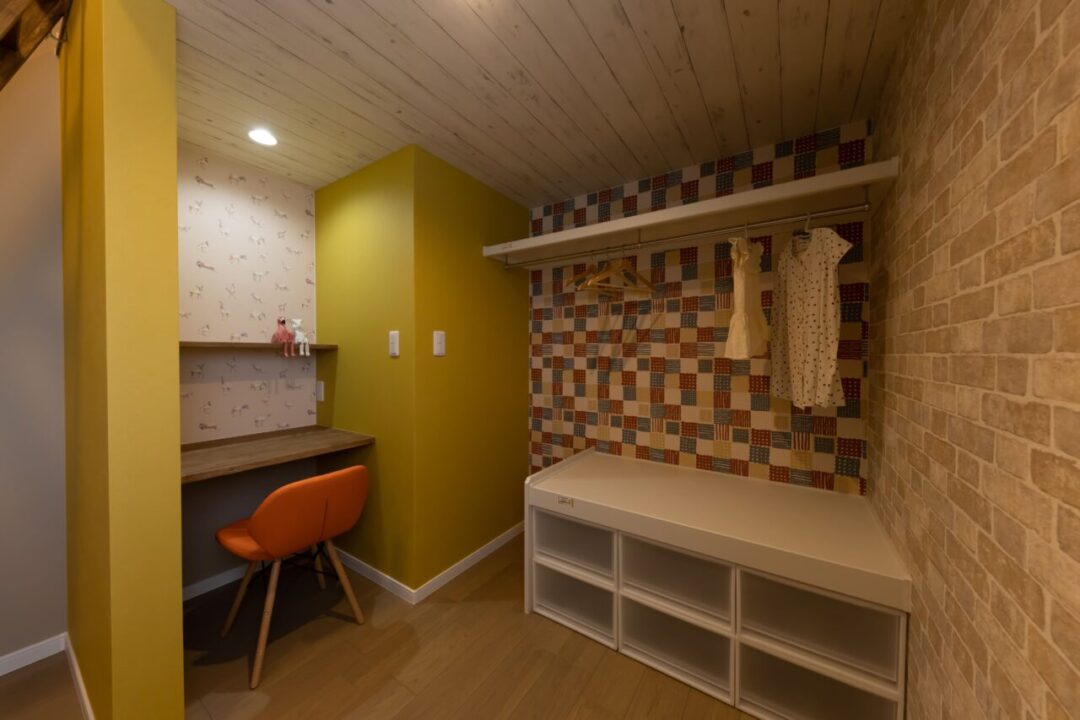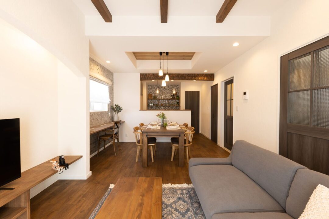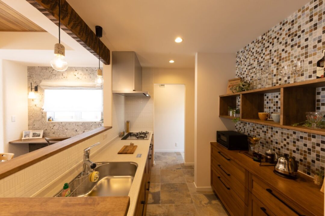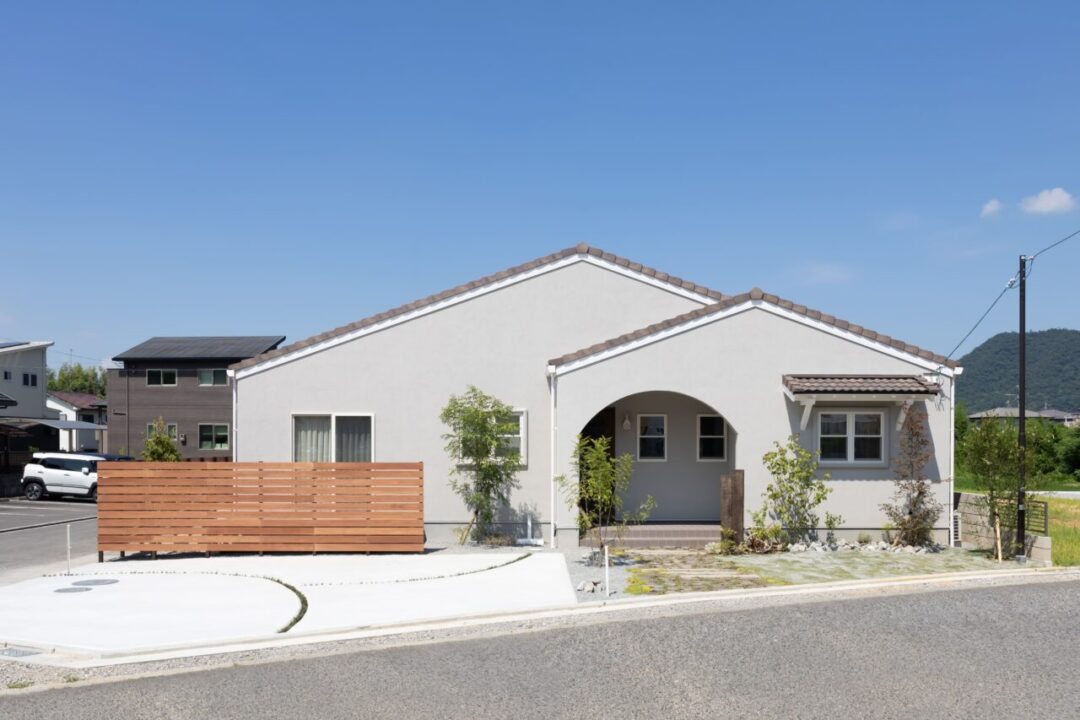 薄いグレーの塗り壁と温かみのある茶色の三角屋根が特徴のこの平屋は、落ち着いた佇まいで自然と調和しています。 内装にはタイルをふんだんに使用し、洗練されたシャビーシックな雰囲気を演出。